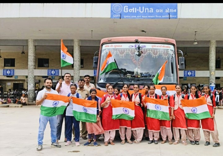 અમરેલી જિલ્લામાં સ્વાતંત્ર્ય પર્વ અંતર્ગત ‘હર ઘર તિરંગા’ અભિયાનનો અનેરો ઉત્સાહ જોવા મળી રહ્યો છે. જિલ્લામાં તાલુકા અને નગરપાલિકા કક્ષાની ઉજવણી અંતર્ગત ઠેર-ઠેર તિરંગા યાત્રાઓ યોજવામાં આવી રહી છે. વિશિષ્ટ પહેલના ભાગરુપે અમરેલી એસ.ટી. સંચાલિત તમામ ૦૭ એસ.ટી. ડેપોમાં તિરંગાનું વિતરણ કરવામાં આવ્યું હતું. રવિવારે એસ.ટી.ના અધિકારીશ્રીઓ અને કર્મયોગીશ્રીઓ દ્વારા બસમાં તિરંગા લહેરાવવામાં આવ્યા હતા. આ ઉપરાંત વિદ્યાર્થીઓ અને મુસાફરોને તિરંગાનું વિતરણ કરવામાં આવ્યું હતું.