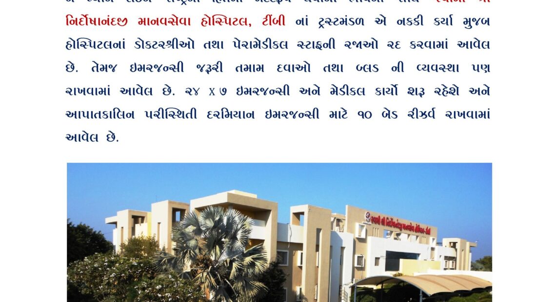 સ્વામી નિર્દોષાનંદ હોસ્પિટલ ટીંબી તમામની રજાઓ રદ્દ