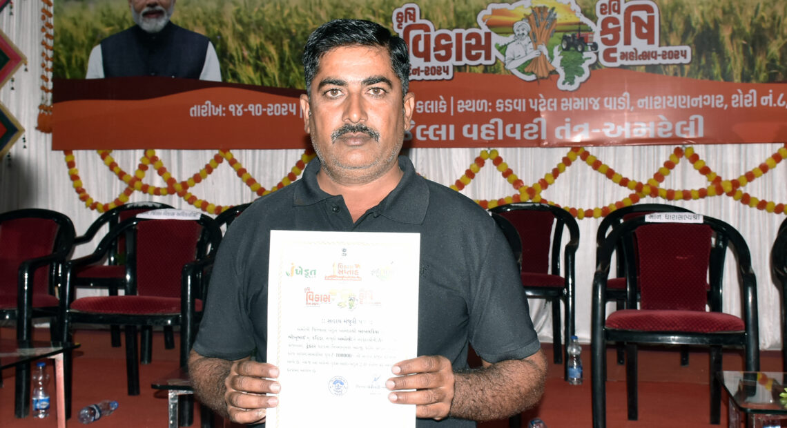 ગુજરાત સરકારની કૃષિ વિકાસલક્ષી યોજનાઓનો લાભ પણ ખેડૂતો સુધી પહોંચી રહ્યો છે. આજરોજ અમરેલી સ્થિત કડવા પટેલ સમાજ વાડી ખાતે જિલ્લા સાંસદશ્રી ભરતભાઈ સુતરીયાની પ્રેરક ઉપસ્થિતિમાં જિલ્લા કક્ષાનો ‘કૃષિ વિકાસ દિન’ ૨૦૨૫ અને ‘રવિ કૃષિ મહોત્સવ’ ૨૦૨૫ કાર્યક્રમ યોજાયો હતો. જેમાં ખેડૂતોને ખેતીના ભારે સાધનો જેવા કે, ટ્રેક્ટર વગેરેની ખરીદી માટે રૂ. ૧ લાખની નાણાકીય સહાયના હુકમો એનાયત કરવામાં આવ્યા હતા. ઉપરાંત એ.જી.આર ૨ એફ.એમ ઘટક યોજના અન્વયે કલ્ટીવેટર ખરીદી માટે સહાય ચૂકવવામાં આવી હતી.