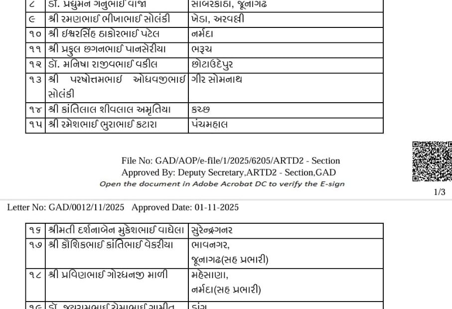 વિશેષ સૂચના મુજબ, હર્ષભાઈ સંઘવીને ગાંધીનગર અને વડોદરા જિલ્લાઓના પ્રભારી મંત્રી બનાવવામાં આવ્યા છે. આ ઉપરાંત, અગાઉ પણ પ્રભારી રહેલા મંત્રીઓ માટે પ્રભારી જિલ્લા યથાવત રાખવામાં આવ્યા, જેથી continuity અને કાર્યક્ષમતા જળવાઈ રહે.