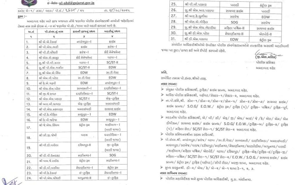 અમદાવાદ શહેર પોલીસ કમિશનર દ્વારા ૩૧ પોલીસ ઇસ્પેકટરની કરી આંતરિક બદલીના ઓર્ડર કર્યા