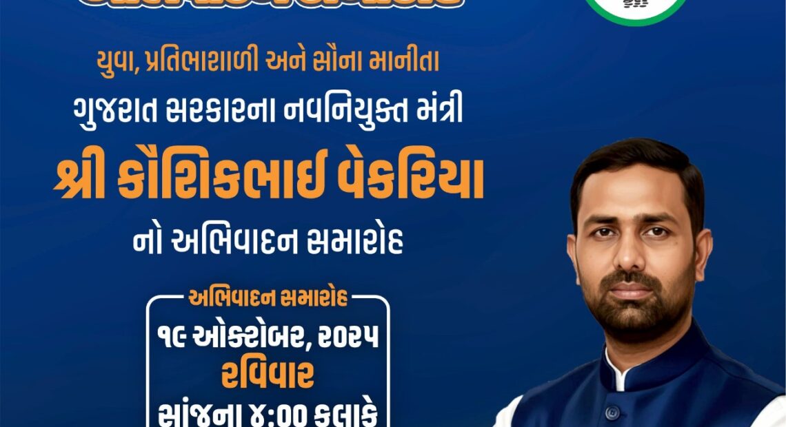 ભારતીય જનતા પાર્ટી અમરેલી જિલ્લા દ્વારા નવનિયુક્ત મંત્રી કૌશિકભાઈ વેકરિયાનો અભિવાદન સમારોહ યોજાશે