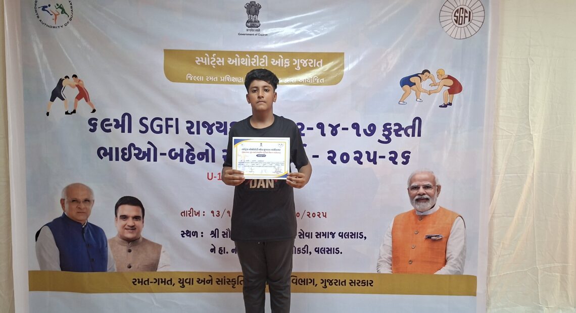 દ્વારા આયોજિત તથા જિલ્લા રમત પ્રશિક્ષણ કેન્દ્ર, વલસાડના અધ્યક્ષ સ્થાને 69 મી S.G.F.I. રાજયકક્ષાની કુસ્તી સ્પર્ધા અંડર – 14 અને 17 (ભાઈઓ)નું આયોજન તા. 16/10/2025 થી 18/18/2025 સુધી કરવામાં આવ્યું હતું. આ સ્પર્ધામાં અંડર – 17 એજ ગ્રુપમાં રાઠોડ પાર્થ નરેન્દ્રભાઇ (ગામ :- ટીમાણા)એ 110 kg માં બ્રોન્ઝ મેડલ, પંડ્યા કપિલ રમેશભાઈ (ગામ :- દેવલી)એ 60 kg માં બ્રોન્ઝ મેડલ તથા રમણા ઋત્વિક રામશંકરભાઇ (ગામ : ચૂડી)એ 92 kg માં બ્રોન્ઝ મેડલ પ્રાપ્ત કર્યા હતા. આ સાથે અંડર – 14 માં સોલંકી જીતરાજસિંહ રાયશંગભાઈ (ગામ :- પિંગળી)એ 75 kg માં બ્રોન્ઝ મેડલ મેળવ્યો હતો. કુસ્તી સ્પર્ધામાં વધારાના 4 બ્રોન્ઝ મેડલ સાથે ગણેશ શાળા – ટીમાણાના બાળકોએ ભાવનગર જિલ્લાનું રાજ્ય કક્ષાએ ગૌરવ વધાર્યું હતું. આમ રાજ્ય સ્તરે ભાવનગર જિલ્લાનું ગૌરવ વધારનાર આ ચારેય બાળકોને ભાવનગર જીલ્લાના D.S.O. શ્રી નરેશભાઈ ગોહિલ સાહેબ તથા ભાવનગર જિલ્લાના વ્યાયામ શિક્ષક સંઘના અધ્યક્ષ શ્રી વી. એમ. જાળેલા સાહેબે શુભેચ્છાઓ પાઠવી હતી. ગણેશ શાળા – ટીમાણા પરિવાર દ્વારા પણ હાર્દિકભાઈ તથા તેને માર્ગદર્શન આપનાર પ્રવીણભાઈ પંડ્યા, નિલેશભાઈ બાંભણિયા તથા જયદીપભાઈ મકવાણાને હાર્દિક શુભેચ્છાઓ પાઠવી હતી.