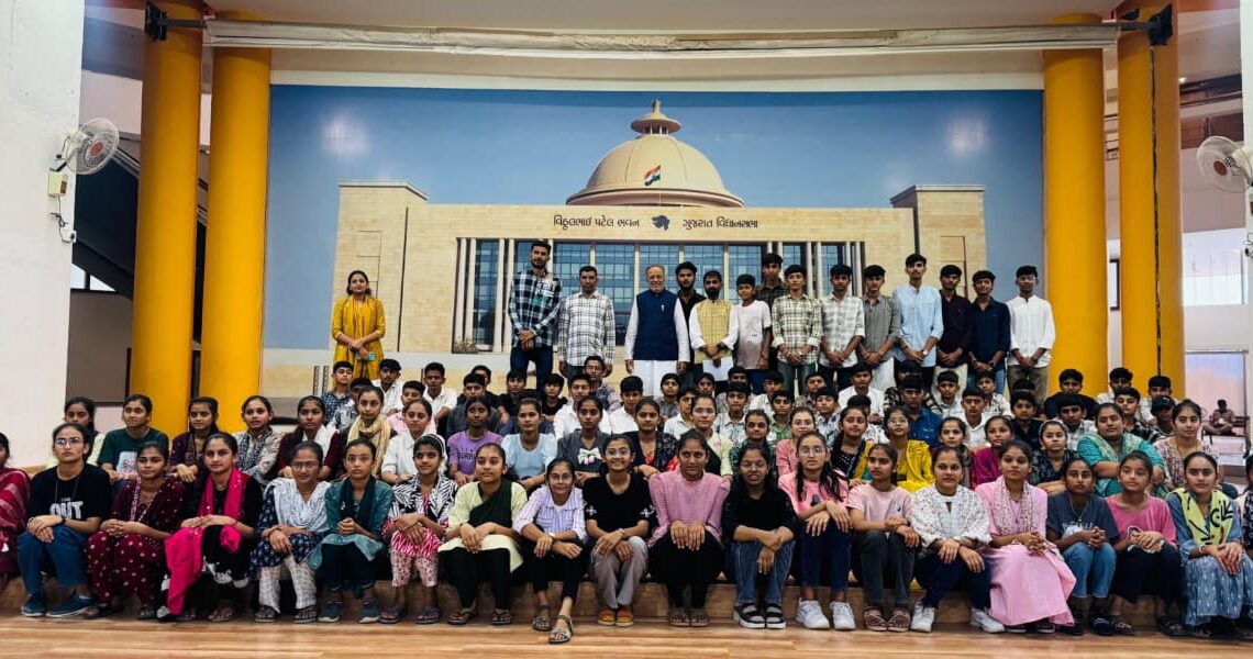 આગળ વિદ્યાર્થીઓએ વિધાનસભા સત્રની મુલાકાત લીધી, જે ખૂબ જ અનોખો અને પ્રેરણાદાયક અનુભવ રહ્યો. વિદ્યાર્થીઓએ સત્રની કામગીરીને જીવંત રીતે નિહાળી અને લોકશાહી વ્યવસ્થાની સમજ મેળવી. આ પ્રસંગે શિક્ષણમંત્રી રિવાબા જાડેજા, ધારાસભ્ય ગૌતમભાઈ ચૌહાણ અને કેબિનેટ મિનિસ્ટર ઋષિકેશ પટેલ સાથે મુલાકાત કરવાનો અવસર મળ્યો, જે વિદ્યાર્થીઓ માટે ગૌરવપૂર્ણ ક્ષણ બની.