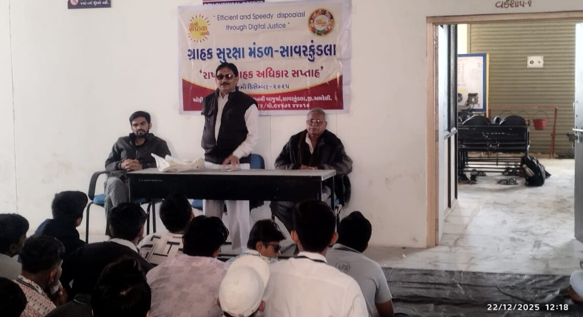 સાવરકુંડલા શહેરમાં મહુવા રોડ પર આવેલ આઈટીઆઈ ખાતે આજરોજ ગ્રાહક સુરક્ષા મંડળ સાવરકુંડલા દ્વારા ગ્રાહક સુરક્ષા જાગૃતિ સપ્તાહ અંતર્ગત એક સેમિનારનું આયોજન કરવામાં આવ્યું હતું જેમાં અહીંના વિદ્યાર્થીઓને ગ્રાહક સુરક્ષા જાગૃતિ માટે પોતાના અધિકારોથી અવગત કરાવવામાં આવેલ ખાસ કરીને સાંપ્રત સમયમાં સાબર ફ્રોડથી સાવધાની રાખવી, પોતાના બેંક એકાઉન્ટ કોઈ પણ અજાણી વ્યક્તિને ભાડે ન આપવા ખરીદી સમયે ઓરિજિનલ બિલનો આગ્રહ રાખવો તેમજ જ્યાં ખરીદેલી પ્રોડક્ટની વોરંટી ગેરંટી બિલમાં દર્શાવેલી હોય એ સમય સુધી ઓરિજિનલ બિલને પણ કાળજી પૂર્વક સાચવવાનું વગરે બાબતોની વિગતે સમજણ આપવામાં આવી હતી. ગ્રાહક સુરક્ષા મંડળ સાવરકુંડલાના પ્રેસિડેન્ટ રમેશભાઈ હીરાણી તેમજ બિપીનભાઈ પાંધીએ ઉપસ્થિત વિદ્યાર્થીઓને ગ્રાહક કાયદા સંબંધિત કોઈ મૂંઝવણ હોય તો સવાલ કરવા પણ જણાવવામાં આવ્યું હતું