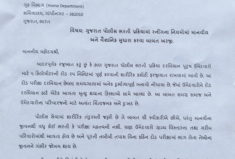 રજૂઆતમાં એ પણ નોંધવામાં આવ્યું છે કે, મોટાભાગના ઉમેદવારો ગ્રામ્ય વિસ્તાર અને સામાન્ય આર્થિક પૃષ્ઠભૂમિ ધરાવતા પરિવારોમાંથી આવે છે. યોગ્ય માર્ગદર્શન કે તબીબી સલાહ વિના સીધી જ આવી કઠિન દોડમાં ભાગ લેવો તેમના માટે જીવલેણ સાબિત થઈ શકે છે. આગામી પોલીસ ભરતીમાં સરકાર આ બાબતે યોગ્ય નિર્ણય લે તેવી આશા સેવાઈ રહી છે.