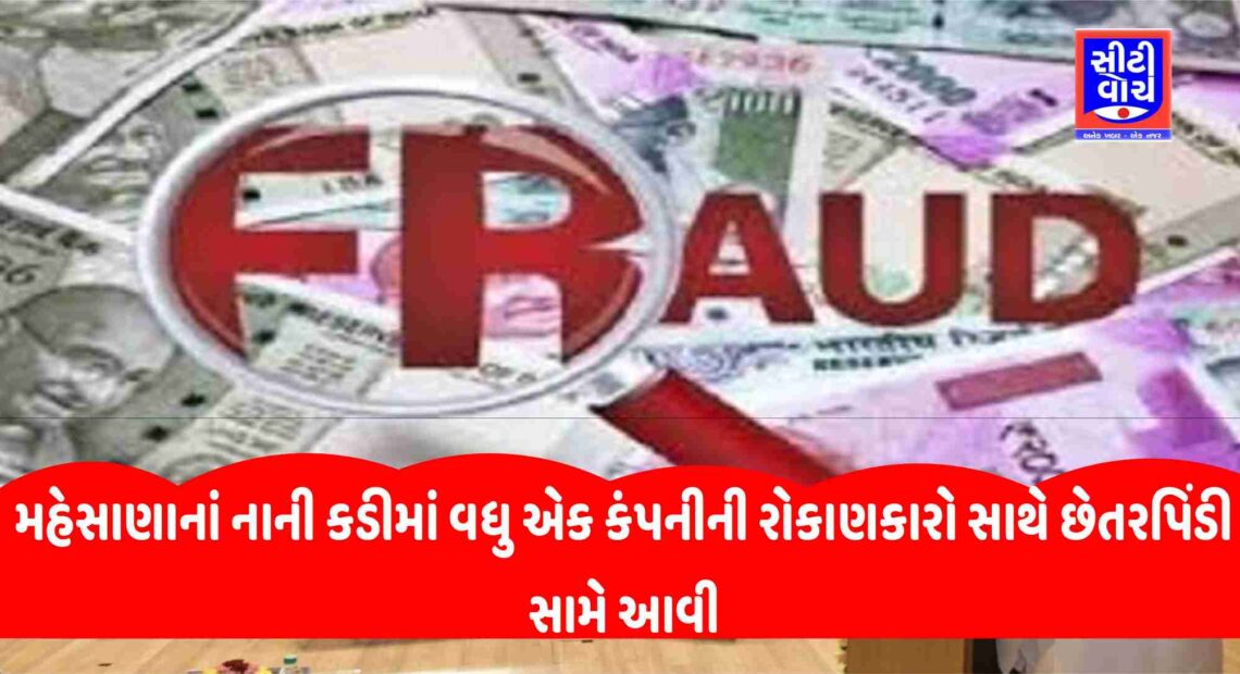 મહેસાણાનાં નાની કડીમાં રોકાણના નામે કરોડો રૂપિયા પડાવ્યા રાજ્યમાં વધુ એક કંપનીની રોકાણકારો સાથે છેતરપિંડી સામે આવી છે. જેમાં મહેસાણાના નાની કડીમાં રોકાણના નામે આરોપીઓે કરોડો રૂપિયા પડાવ્યા હતા. સ્જી પ્રોપર્ટી અને ક્રાઉન ફિન નામની ઓફિસ ખોલીને આરોપીઓએ લોકો પાસેથી નાણાં પડાવ્યા હોવાનું બહાર આવ્યું છે. જેમાં રોકાણ પર ૧૦ ટકાનું વળતર આપવાની કૌભાંડીઓએ લાલચ આપી હોવાનું પણ તપાસમાં બહાર આવ્યું છે.