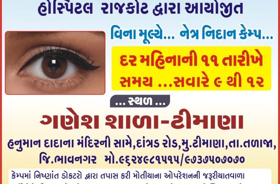 રણછોડ દાસજી બાપું ચેરીટેબલ હોસ્પિટલ રાજકોટ દ્વારા વિનામૂલ્યે નેત્ર-નિદાન કેમ્પ ગણેશ શાળા – ટીમાણા ( તા.તળાજા, જિ. ભાવનગર) ખાતે તા: ૧૧-૦૪-૨૦૨૬ (શનિવાર) ના રાખવામાં આવેલ છે. જેમા જરૂરિયાત વાળા દર્દીની આંખની તપાસ તથા મોતિયા વાળા દર્દીને રાજકોટ સ્પેશલ વાહન દ્વારા લઇ જઇ ઓપરેશન કરી આપવામાં આવે છે.
