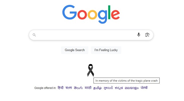 અમદાવાદ વિમાન દુર્ઘટનાના પીડિતોને શ્રદ્ધાંજલિ આપવા ગૂગલે હોમપેજ પર કાળી રિબીન લગાવીને શ્રદ્ધાંજલિ આપી