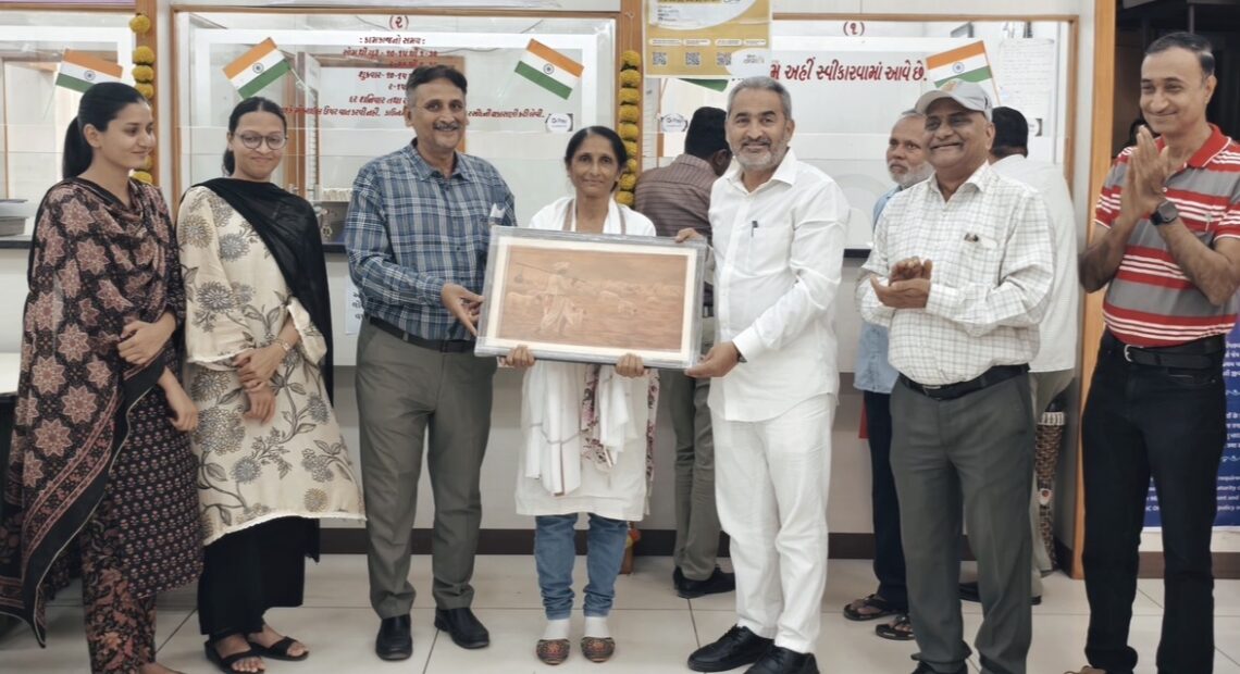 આજે તા.૨૭/૨/૨૬ ના રોજ જાણીતા હાસ્યકલાકાર, લેખક અને સમાજસેવક ડો. જગદીશ ત્રિવેદીએ આ કર્મચારીની અથાક સેવાને ધ્યાનમાં રાખી આજરોજ સુરેન્દ્રનગર શાખામાં જઈને બ્રાન્ચ મેનેજર શ્રીવાસ્તવસાહેબ તથા સમગ્ર સ્ટાફની ઉપસ્થિતિમાં મમતાબહેન દવેનું શાલ ઓઢાડી તેમજ મોમેન્ટો દ્રારા સન્માન કર્યું હતું.