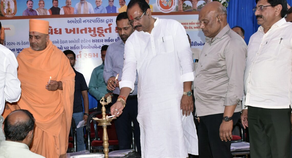 અમરેલી ખાતે ‘ત્રિવિધ’ વિકાસ પ્રકલ્પોના ખાતમુહૂર્ત પ્રસંગે શ્રી સ્વામિનારાયણ મંદિર-આધ્યાત્મ સ્વરૂપ સ્વામી અને સાધુચરિત સ્વામી, નગરપાલિકાના પ્રમુખ શ્રી બિપીનભાઈ લીંબાણી, ઉપપ્રમુશ્રી બિનાબેન કાલેણા, કારોબારી ચેરમેનશ્રી મનિષભાઈ ધરજીયા, માર્કેટિંગ યાર્ડ પૂર્વ ચેરમેન શ્રી પી.પી.સોજીત્રા, જિલ્લાના હોદ્દેદારશ્રીઓ, જિલ્લા કલેક્ટર શ્રી વિકલ્પ ભારદ્વાજ, જિલ્લા વિકાસ અધિકારીશ્રી પરિમલ પંડ્યા, જિલ્લા પોલીસ વડા શ્રી સંજય ખરાત, ચીફ ઓફિસર શ્રી વી.સી.રાઠોડ સહિત બહોળી સંખ્યામાં નગરજનો ઉપસ્થિત રહ્યા હતા.