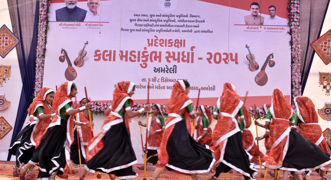 અમરેલી-વડિયા-કુંકાવાવના ધારાસભ્યશ્રી અને ઉર્જા,કાયદો અને ન્યાય, વૈધાનિક અને સંસદીય બાબતોના રાજ્યમંત્રીશ્રી, કૌશિકભાઈ વેકરીયાની ઉષ્માસભર ઉપસ્થિતિમાં અમરેલી મુકામે પ્રદેશકક્ષા કલા મહાકુંભ સ્પર્ધા-૨૦૨૫નો ઉત્સાહભેર શુભારંભ થયો હતો. શહેરની કે.કે પારેખ અને મહેતા આર.પી. વિદ્યાલય (નૂતન મીડલ સ્કૂલ) ખાતે સૌરાષ્ટ્રના ૦૮ જિલ્લા અને ૦૪ મહાનગરોના ૪,૦૦૦ જેટલા સ્પર્ધકોના સંગમથી કલા અને સંસ્કૃતિની સરવાણી થશે.