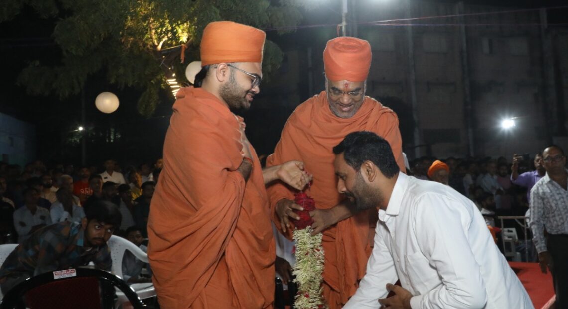 નવ નિયુક્ત રાજ્ય કક્ષાના મંત્રીકૌશિકભાઈ વેકરીયાના અભિવાદન સમારોહમાં આશીર્વાદ આપતાં સાવરકુંડલા ગુરુકુળના પ્રમુખ શ્રી શાસ્ત્રી હરિપ્રસાદાસજી સ્વામી