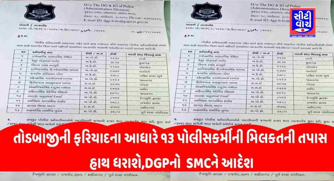 ગુજરાતમાં થોડા સમય પહેલા પોલીસકર્મીની બદલી કરવામાં આવી હતી. જેમાંથી કેટલાક પોલીસ કર્મચારીની બદલી અમદાવાદ જિલ્લાની બહાર પણ કરવામાં આવી હતી. બદલી કરવામાં આવેલા પોલીસ કર્મચારીમાંથી ૧૩ પોલીસકર્મીની મિલકતની તપાસના આદેશ આપવામાં આવ્યા છે. આ તમામ કર્મચારીઓની જિલ્લા બહાર બદલી કરવામાં આવી હતી. ડ્ઢય્ઁએ સ્ટેટ મોનિટરિંગ સેલને તપાસ કરવા માટે આદેશ કર્યો છે. અમદાવાદમાં તોડબાજીની ફરિયાદને આધારે બદલીઓ કરવામાં આવી હતી. પોલીસકર્મી અને તેના પરિવારના નામે કેટલી મિલકતો તેની તપાસ હાથ ધરવામાં આવશે. મળતી માહિતી અનુસાર ૧૩ પોલીસકર્મી કોન્સ્ટેબલ અને હેડકોન્સ્ટેબલ તરીકે ફરજ બજાવતા હતા. પોલીસકર્મી અને તેના પરિવારની મિલકતો, બેંક બેલેન્સ, વાહનો, લૉકર સહિતની તપાસ કરવામાં આવશે.