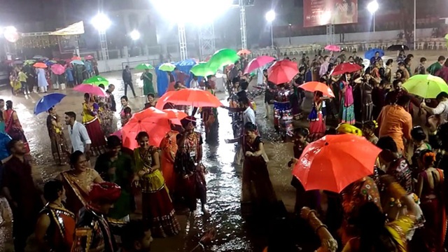 હવામાન વિભાગની આગોતરી આગાહી અનુસાર દક્ષિણ અને મધ્ય ગુજરાતમાં નવરાત્રી સાથે જ મેઘરાજાની પધરામણી થઈ છે. દક્ષિણ અને મધ્ય ગુજરાતમાં વરસાદી તાંડવ થયું હોય તેમ દોઢથી માંડીને આઠ ઈંચ સુધી વરસાદ નોંધાયો છે. ખાસ કરીને દક્ષિણ ગુજરાતમાં આઠ ઈંચ સુધી વરસાદ ખાબક્યો છે. ખાસ કરીને ગરબાની ધૂમ મચે છે તેવા મહાનગરો અમદાવાદ, સુરત, વડોદરા અને રાજકોટમાં વરસાદી માહોલના કારણે નવરાત્રીની ઉજવણીમાં વિક્ષેપ સર્જાયો છે. ચાર મહાનગરો અને આસપાસના અનેક ગામોમાં ગરબાના અનેક આયોજનો એક દિવસ માટે રદ કરવાની ફરજ પડી હતી. કચ્છના રાપરમાં ઝાપટાં સિવાય બફારા વચ્ચે વરસાદની સંભાવના છે. દક્ષિણ અને મધ્ય ગુજરાતમાં વરસાદી માહોલ હજુ બે દિવસ સુધી રહેવાની આગાહી કરાઈ છે. નવરાત્રી દરમિયાન અમદાવાદ અને ગાંધીનગર શહેર જાણે એક બની ગયાં છે. નવરાત્રીની ઉજવણીની ધૂમ જામી હતી ત્યાં રવિવારે બપોરથી અમદાવાદ – ગાંધીનગર વચ્ચે વરસાદી માહોલથી નવરાત્રીની ઉજવણી ધોવાઈ ગઈ હતી. બપોરથી રાત સુધીમાં દોઢથી બે ઈંચ વરસાદથી અમદાવાદ અને ગાંધીનગર હાઈવે ઉપર નવરાત્રીના સરકારી અને ખાનગી આયોજનો રવિવારે મુલતવી રાખવા પડયાં હતાં. અમદાવાદ – ગાંધીનગરમાં શેરી અને સોસાયટીઓના ઘણાંખરાં ગરબામાં આરતી સાથે આદ્યશક્તિની આરાધનાનું ગાન કરાયું હતું. હજુ વરસાદની આગાહી હોવાથી સોમવારની સ્થિતિ શું હશે તેના ઉપર ખેલૈયાઓની નજર છે.
