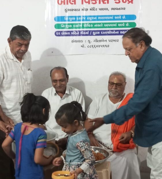 કુંભારવાડાના બાળસંસ્કાર કેન્દ્રમાં બાળકોને દિવાળીની મીઠાઈ અર્પણ કરતાં રામકૃષ્ણ શાસ્ત્રી