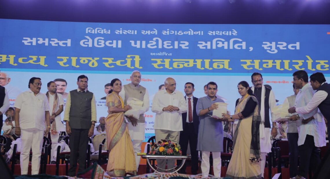 સુરત: તા.૦૩જાન્યુઆરી: સુરતની વિવિધ સંસ્થા અને સંગઠનોના સહયોગથી સમસ્ત લેઉવા પાટીદાર સમિતિ-સુરત દ્વારા મુખ્યમંત્રીશ્રી ભૂપેન્દ્ર પટેલના અધ્યક્ષસ્થાને મોટા વરાછા ખાતે ‘ભવ્ય રાજસ્વી સન્માન સમારોહ’ યોજાયો હતો.