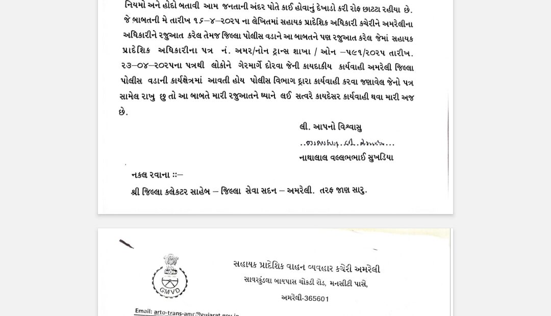 જાણીતા આર ટી આઈ એક્ટિવિસ્ટ નાથાલાલ સુખડીયા એ રાજ્ય ના ગૃહમંત્રી હર્ષભાઇ સંઘવી અને પ્રાદેશિક વાહન નિયમન કચેરી ને પત્ર પાઠવી અમરેલી લોકસભા ના પૂર્વ સાંસદ સામે મોટર વેહિકલ એકટ હેઠળ કાર્યવાહી કરવા માંગ કરી છે અમરેલી લોકસભા ના પૂર્વ સાંસદ નારણભાઈ કાછડીયા ની ગાડીની નેમ પ્લેટ અન્વયે એમ.વી. એકટ હેઠળ કાર્યવાહી પ્રાદેશિક વાહન વહેવાર કચેરી સહિત સબંધ કરતા ઓને રજુઆત અમરેલીના પૂર્વ સાંસદ નારણભાઈ કાછડીયા પોતે હવે હોદા પર ન હોવા છતાં તેની ગાડી નંબર GJ-14-AP-6150 અને GJ-14-BG-0150 નંબરની કોર જીલ ગાડીઓ પર લાલ બોર્ડ નેમ પ્લેટ લગાવી ફરતા હોઈ, જે હાલ સાંસદ તરીકે પણ નથી. તેમ છતાં આમ જનતાની અંદર ખોટી ઓળખ ઉભી કરી ટ્રાફીકના નિયમો અને હોદો બતાવી આમ જનતાની અંદર પોતે કાઈ હોવાનું દેખાડો કરી રોફ છાય રહીયા છે. જે બાબતની મે તારીખ ૧૬-૪-૨૦૨૫ ના લેખિતમાં સહાયક પ્રાદેશિક અધિકારી કચેરીને અમરેલીના અવિકારીને રજુઆત કરેલ તેમજ જિલ્લા પોલીસ વડાને આ બાબતને પણ રજુઆત કરેલ જેમાં સહાયક પ્રાદેશિક અધિકારીના પત્ર નં. અમર/નોન ટ્રાન્સ શાખા / ઓન-૫૯૧/૨૦૨૫ તારીખ. ૨૩-૦૪-૨૦૨૫ના પત્રથી લોકોને ગેરમાર્ગે દોરવા જેની કાયદાકીય કાર્યવાહી અમરેલી જિલ્લા પોલીસ વડાની કાર્યક્ષેત્રમાં આવતી હોય પોલીસ વિભાગ દ્વારા કાર્યવાહી કરવા જણાવેલ જેનો પત્ર સામેલ રાખુ છુ તો આ બાબતે મારી રજુઆતને ધ્યાને લઈ સત્વરે કાયદેસર કાર્યવાહી થવા મારી શ્રી જિલ્લા કલેક્ટર સાહેબ-જિલ્લા સેવા સદન- અમરેલી.સહાયક પ્રાદેશિક વાહન વ્યવહાર કચેરી અમરેલી સાવરકુંડલા બાયપાસ ચોકડી રોડ શ્રી કલેક્ટર અને જિલ્લા મેજિસ્ટ્રેટથીની કચેરી, અમરેલીના પૂર્વ સાંસદ નારણભાઈ કાછડીયટ પોતે હવે હોય પર ન હોવા છતા તેની ગાડી ને GF-14-AP- GI30 અને G-18 80-8150 નંબરની ફોરવલિલ ગાડીઓ પર સવલ વોર્ડ નેમ પ્લેટ લગાવી ફરતા હોઈ જે અંગે એમવી એક્ટ હેઠળ કાર્યવાહી કરવાની થાય છે. ઉપરાંત હોદા પર ન હોવા છતા ગાડી પર ખોટી ઓળખ લખીને ખોટી ઓળખ ઉભી કરીને લોકોને ગેરમાર્ગે દોરવા જેની  અમરેલી જિલ્લા પોલીસના કાર્યક્ષેત્રમાં આવતી હોઈ પોલીસ વિભાગ દ્વારા કાર્યવારી કરવાની રહે છે તેમ આર ટી આઇ એક્ટિવિસ્ટ સુખડીયા એ પત્ર માં જણાવ્યું છે