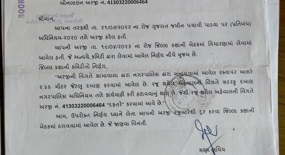 પૂર્વ પાલિકા સદસ્ય સામે લેન્ડ ગ્રીબીગ કેસ માં થયેલ હુકમ નો અમલ ક્યારે ? સાર્વજનિક રસ્તા ની જમીન ઉપર મકાન બનાવી લેતા નેતા સામે જિલ્લા વહીવટી તંત્ર ને ૪૯ લેખિત ફરિયાદો મળી હોવા નો એકરાર